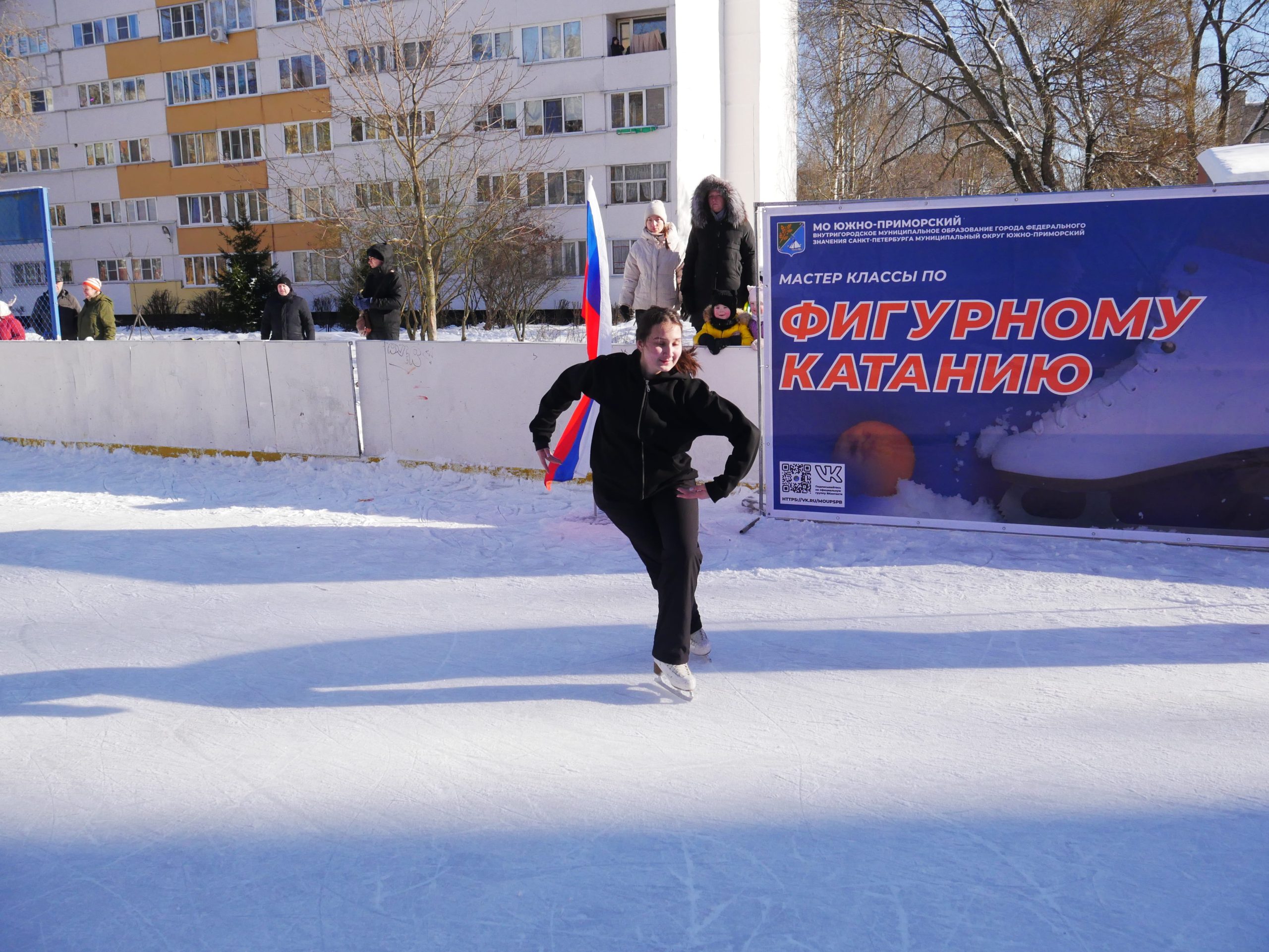 На исходе зимы любящие спорт жители Муниципального образования Южно-Приморский осваивали навыки танцев на льду. Состоялись два мастер-класса фигурного катания. На них записались свыше 100 человек.