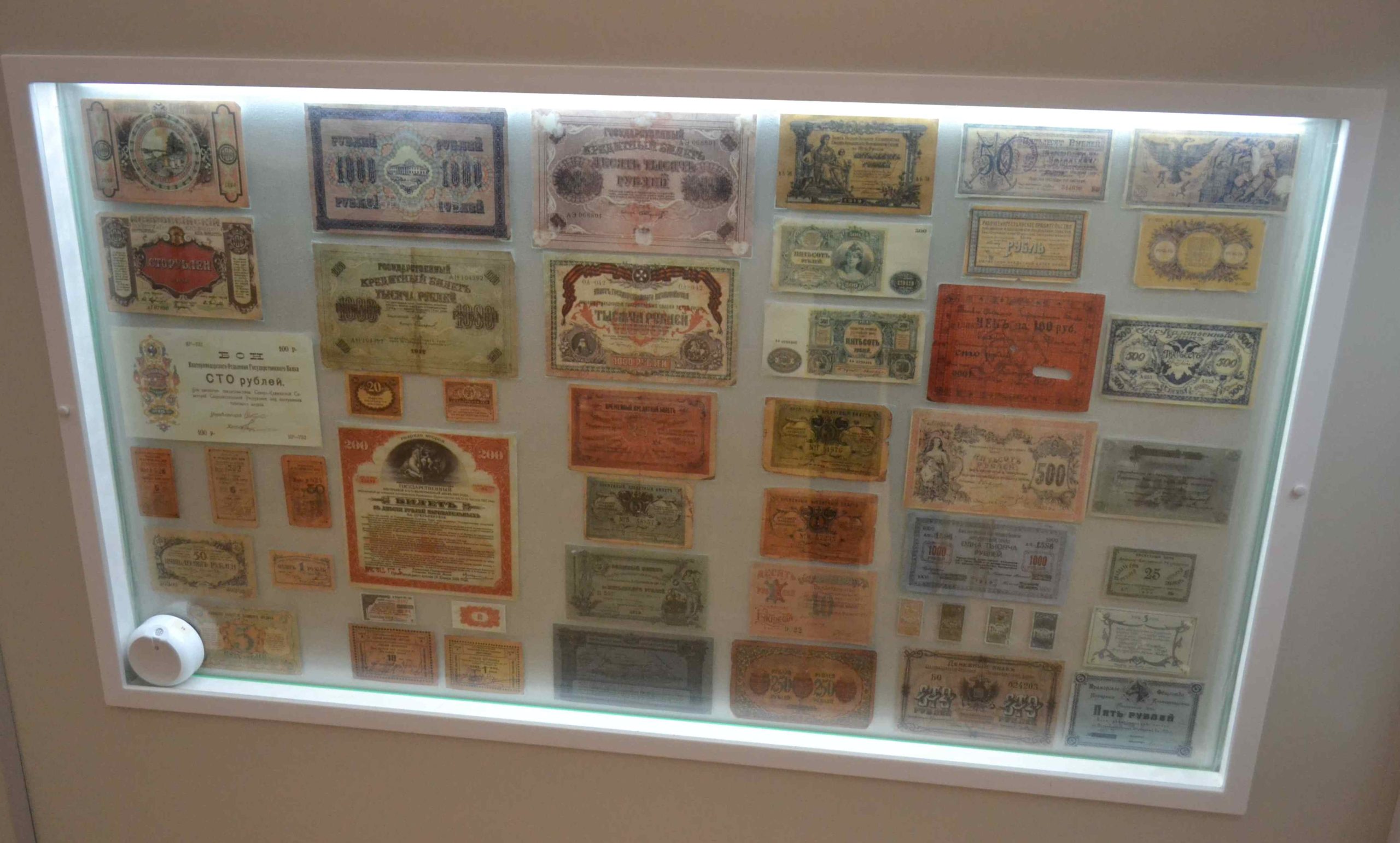 Среди многочисленных денежных знаков и ценных бумаг от эпохи Екатерины II до распада Советского Союза есть ассигнации, банкноты, денежные суррогаты времен революции и Гражданской войны, банковские документы и акции.